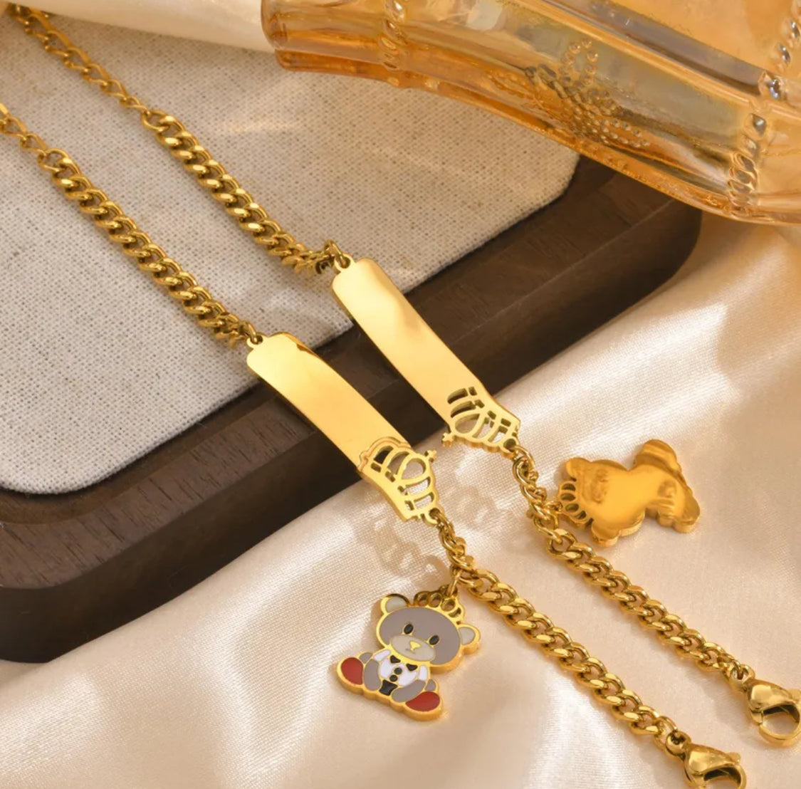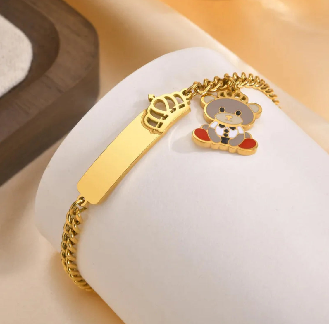 Låt ditt barn glänsa med detta bedårande armband i 304 rostfritt stål, dekorerat med en söt björn och en liten krona. Den lekfulla designen gör armbandet perfekt för både vardag och fest, samtidigt som materialet gör det slitstarkt och skonsamt mot huden.