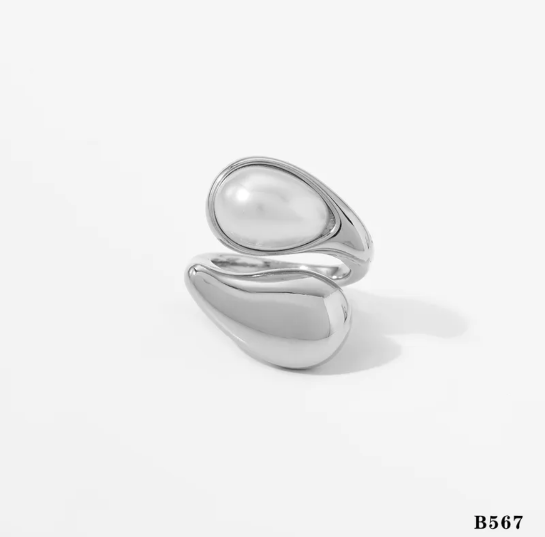 Varje ring är smyckad med en droppformad sten – antingen i varm brun ton, klassisk pärlvit, eller som i vår silvriga variant: en klarvit sten som ger ett stilrent och lyxigt uttryck.